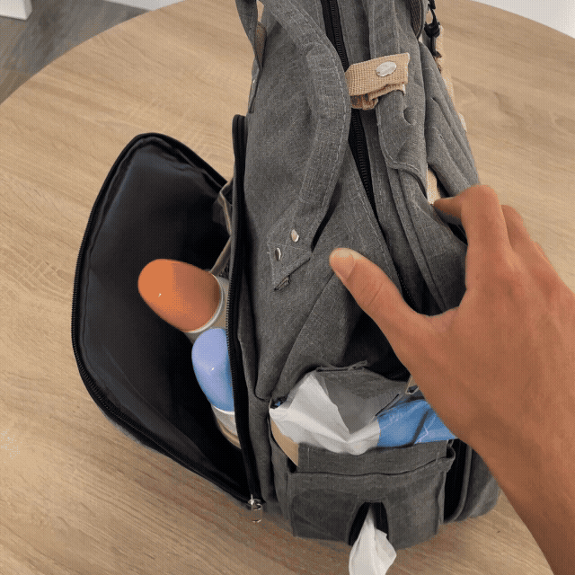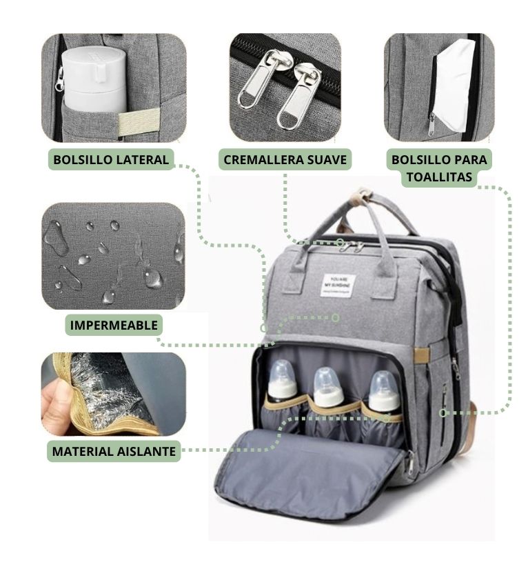 Diseñada con múltiples compartimentos inteligentes, incluye bolsillos térmicos para mantener los biberones calientes, puerto USB para conectar una batería portátil y un colchón extensible que se convierte en una práctica cuna o cambiador portátil.